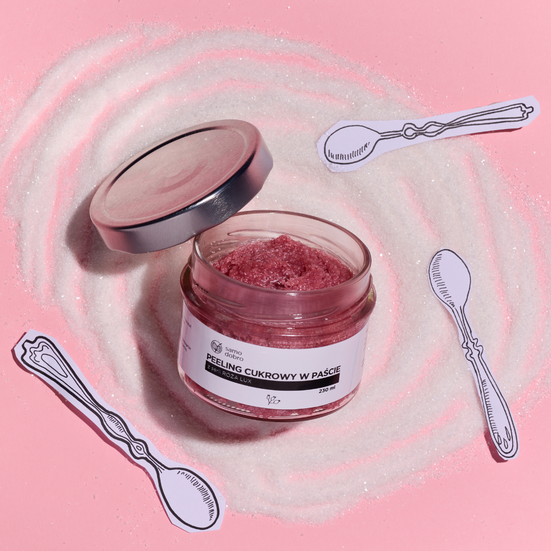Mydło w paście (potasowe) oczywiście myje, ale też pielęgnuje i w dodatku działa jak peeling enzymatyczny – rozpuszcza i złuszcza zrogowaciałą warstwę naskórka. Działanie peelingujące wzmocniłyśmy, dodając do niego cukier, by jeszcze lepiej działało na ciało.