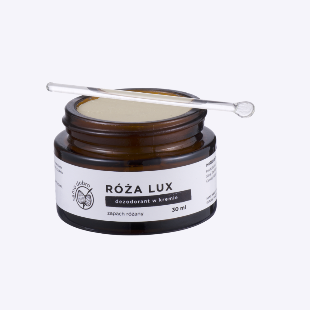 Dezodorant łagodny dla pach i pachnący łagodnie. Dla wielbicielek kwiatowych nut, a zwłaszcza róży. Zapach zawdzięcza woskowi różanemu, ekskluzywnemu produktowi, który dodałyśmy do receptury. To wosk kwiatowy z róży damasceńskiej, pachnie przepięknie, ale delikatnie.
