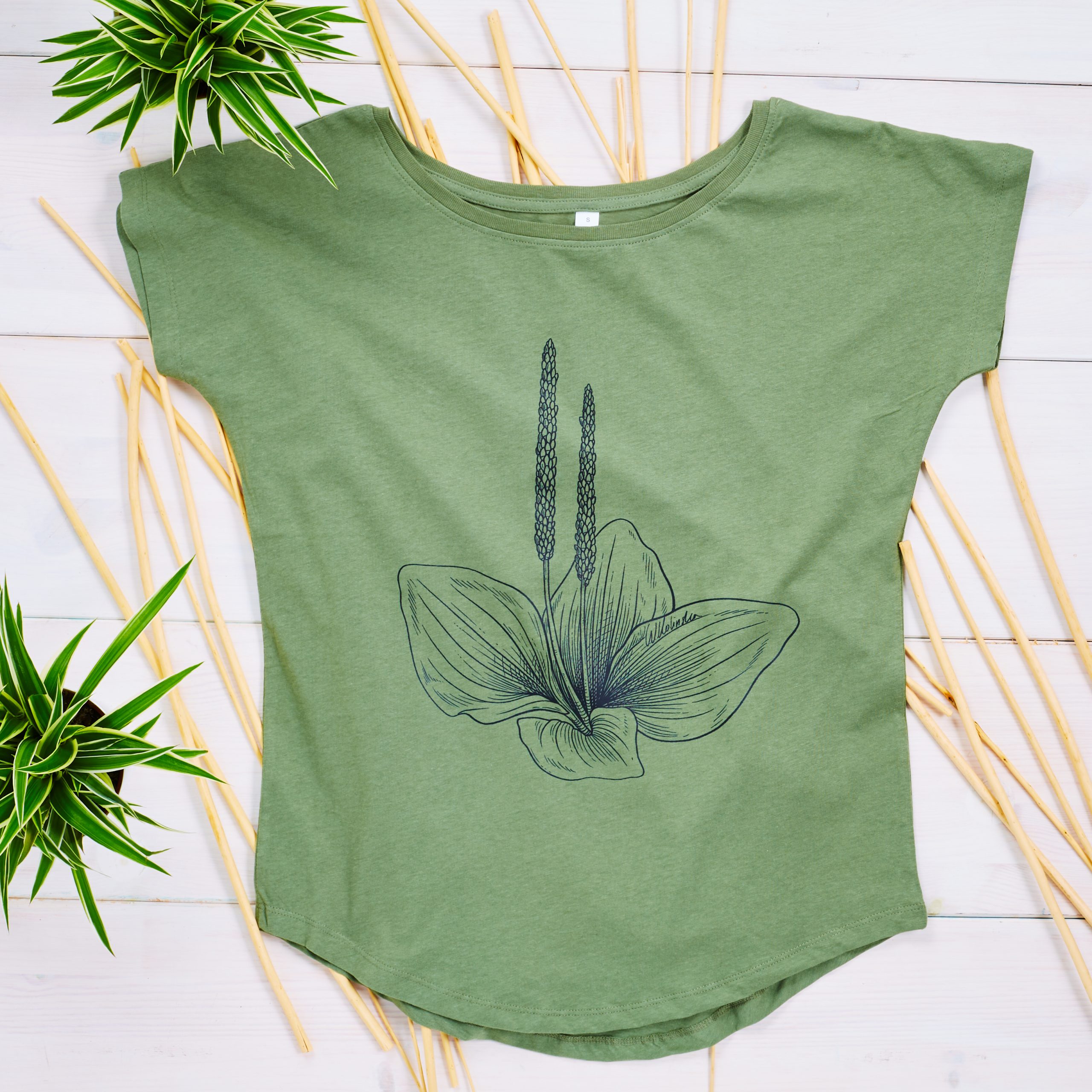 Tiszert dla fajnej babki uszyty z organicznych materiałów z nadrukiem rysunku babki lekarskiej zaprojektowanym specjalnie dla nas przez Weronikę Kolińską.