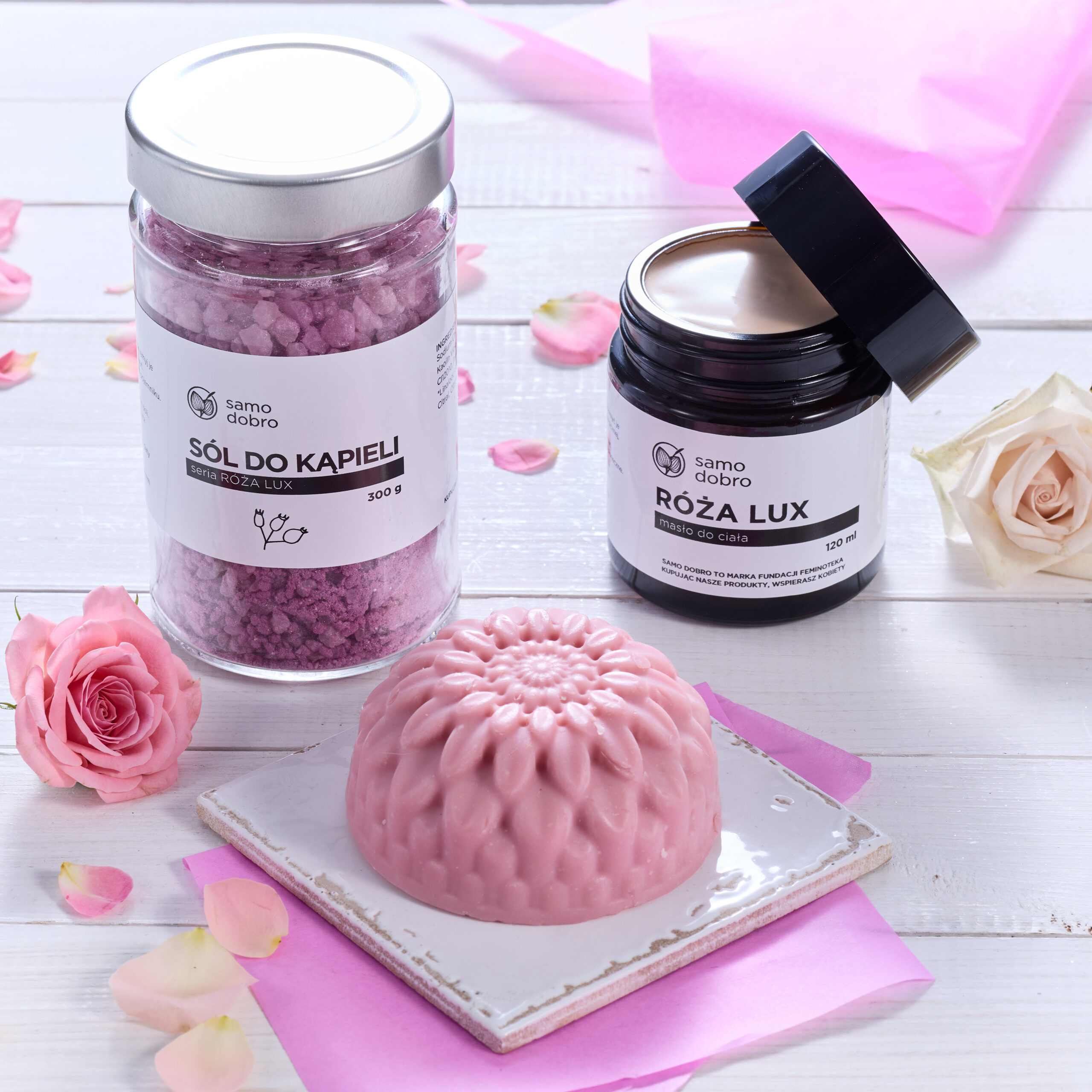 Kosmetyki do kąpieli i po z serii Róża Lux: sól do kąpieli z solą Epsom i fioletową glinką, mydło różane na hydrolacie z róży i masło do ciała z woskiem różanym. Zestaw pachnie owocowo-kwiatowo różą i brzoskwinią