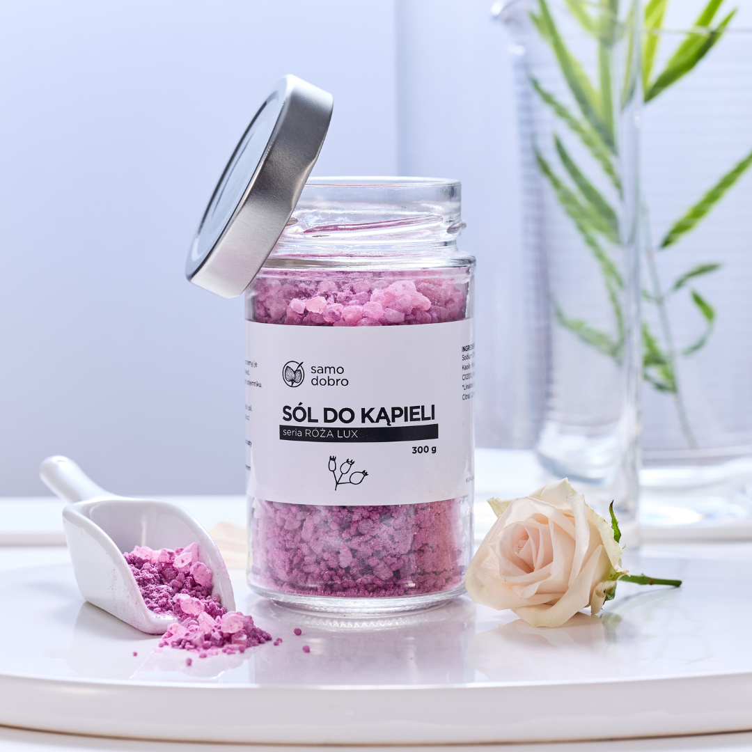 sól do kąpieli z solą Epsom, fioletową glinką francuską i mocznikiem, co gwarantuje jedwabistą, ujędrniona i zregenerowaną skórę, mocznik odpowiada za odpowiednie nawilżenie, glinka fioletowa za oczyszczenie i gładkość