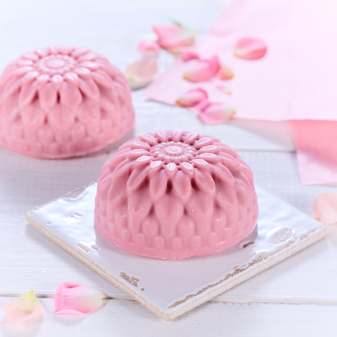 mydło w pięknej kwiatowej kostce zrobione na hydrolacie różanym, rozkosznie się pieniące i pachnące